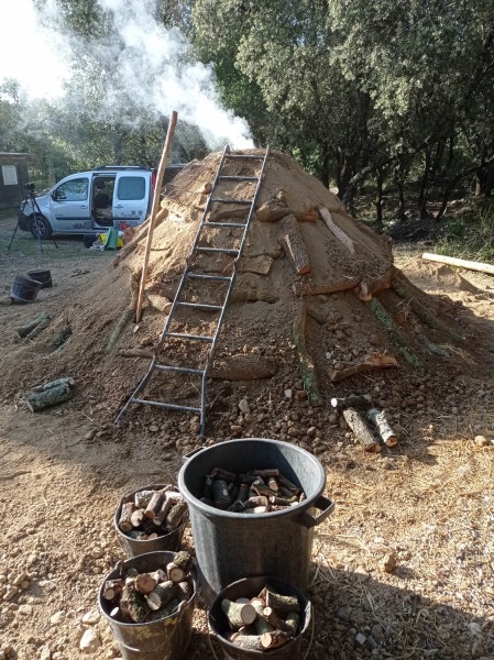 Belle semaine de charbonniers chez Jean. Cette année le bois était très sec malgré une météo un peu humide. La conduite de la carbonisation demande une attention plus soutenue car le bois sec accélère le processus. La veille est importante pour stabiliser la descente du feu. De plus le charbon semble plus friable.