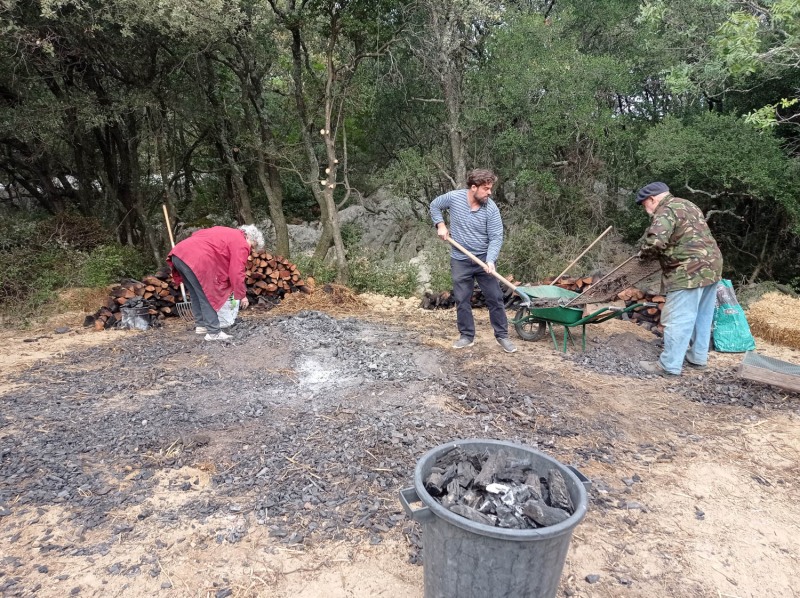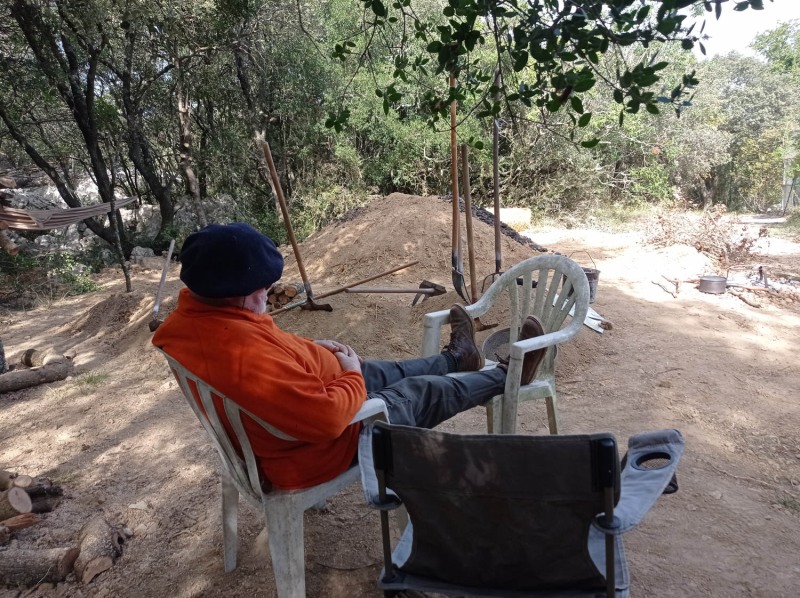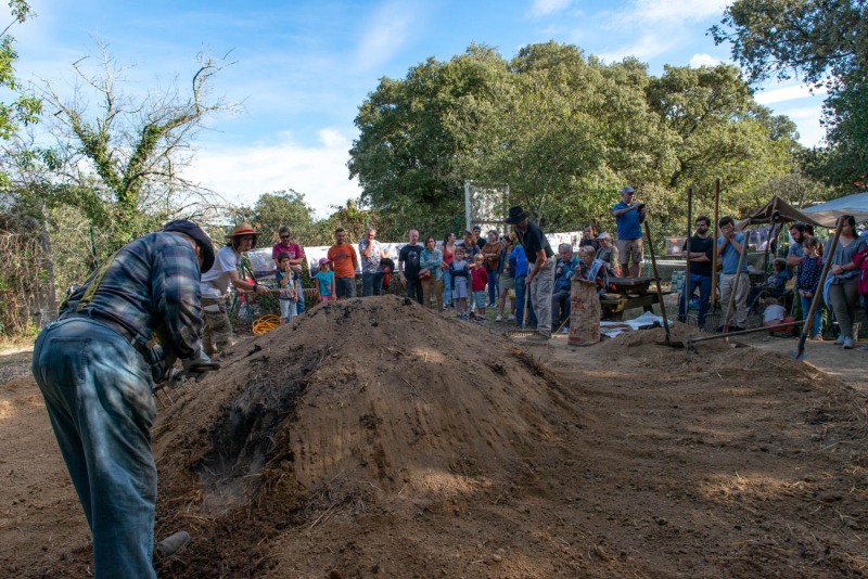Cette année nous n’avons pu que passer 2 jours et demi chez Jean, dans son domaine de garrigue. Moment important, le cavage, c’est-à-dire la récupération du charbon en fin de cuisson. Je n’avais pas eu l’occasion d’y assister les fois précédentes. Intéressant de voir comment son équipe, les forgeron-es et métallurgistes, répartissent les bouts de charbon en marguerite autour de la meule. La terre noire est très poussiéreuse, l’usage de masques est salvatrice.