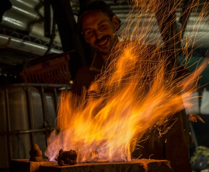 Jean continue son festival charbonnière avec son équipe de martelleurs qu’on appelle des forgerons voir des métallurgistes ! En tout cas c’est toujours chouette et sympathique.