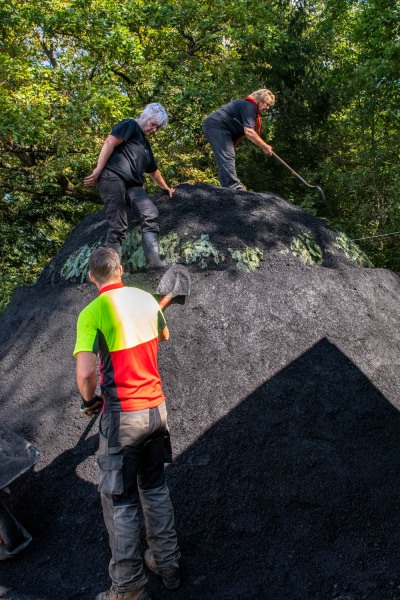 Extraction du charbon, mise en tas des incuits, tamisage de la terre et dépôt de celle-ci en couronne tout autour, les gestes sont précis, on sent l’expérience de chacun.