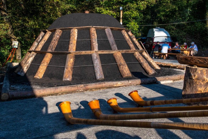 Là, une association de plus de 500 personnes, nous ont accueilli pendant trois jours et demi. Nous ! 300 charbonniers, principalement allemands et aussi slovaques, italiens, anglais et bien sur français. Et donc deux femmes, qui étaient chez elles et qui seront les maitresses charbonnières de la meule construites sur place. https://www.850-johr-speuz.ch/