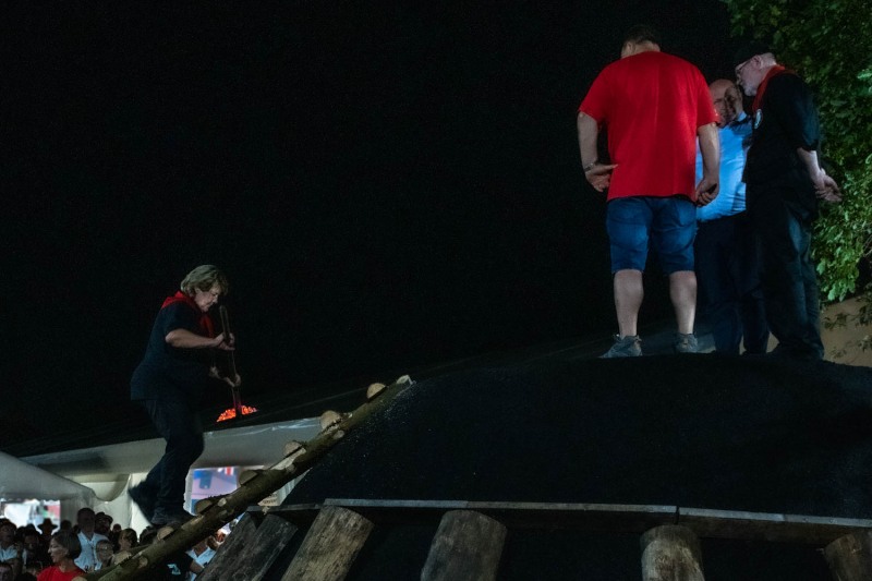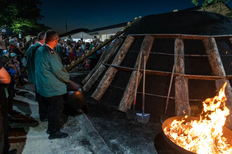 Deux pelles de braises suffiront pour démarrer. Perché au sommet de la meule, tout un aréopage de personnalités, discourent avant que Doris monte avec la première pelle. Une fois celle-ci vidée dans la cheminée, Doris redescend avec agilité sur la grosse échelle et sa compagne de travail lui donne une autre pelle chargée de braise. Une fois vidée, c’est au tour d’un verre de schnaps d’être versé dans le trou. Tout ce beau monde se congratule puis quitte le sommet pour retrouver la foule au pied de la meule. Un beau spectacle accompagné par les sonneurs de cloches avec leur musique un peu particulière, bling blong !