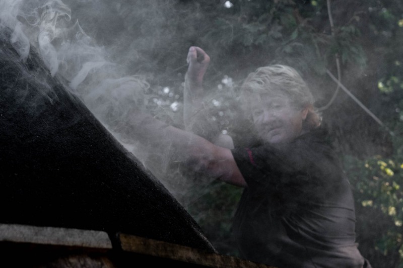 Il y avait donc trois charbonnières au colloque des charbonniers d’Europe. L’une était la meule de bois à carboniser et plus important, deux femmes charbonnières, qui se sont attelées à la conduite du feu dans la meule.