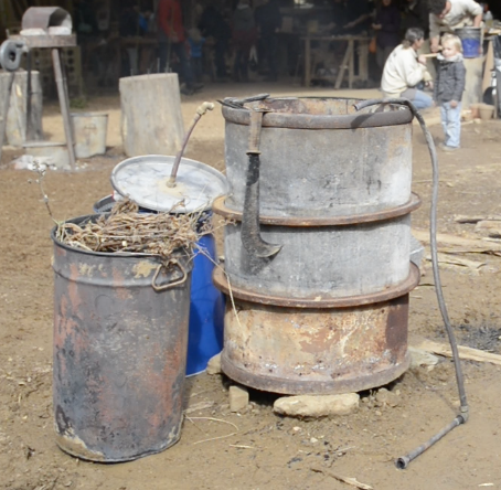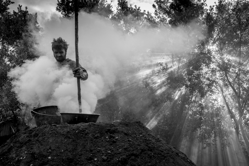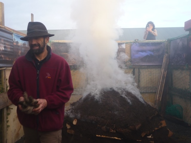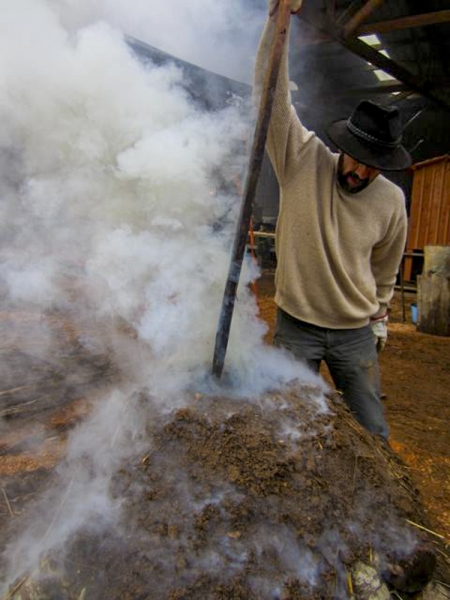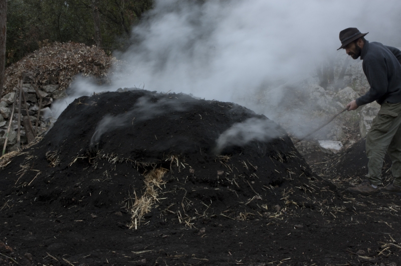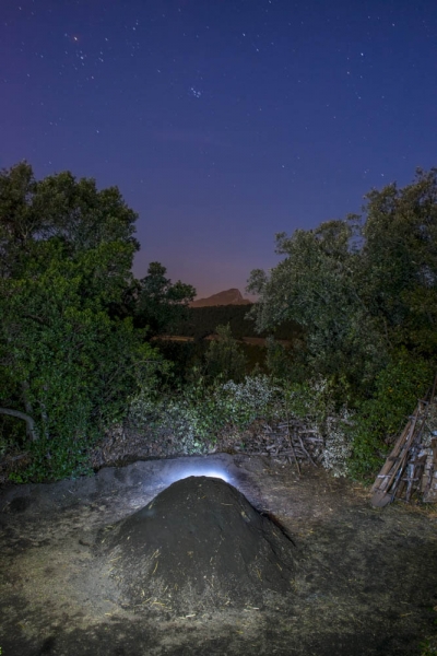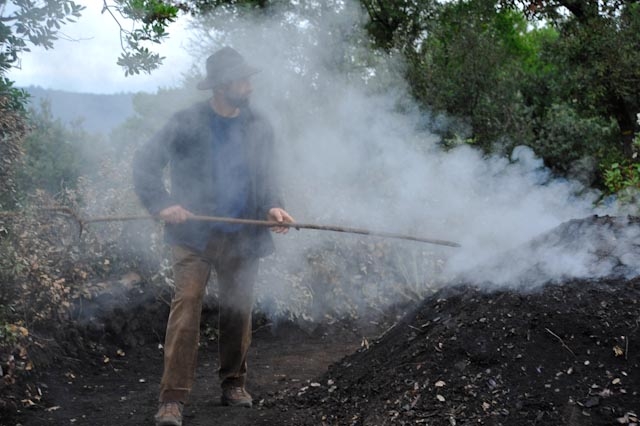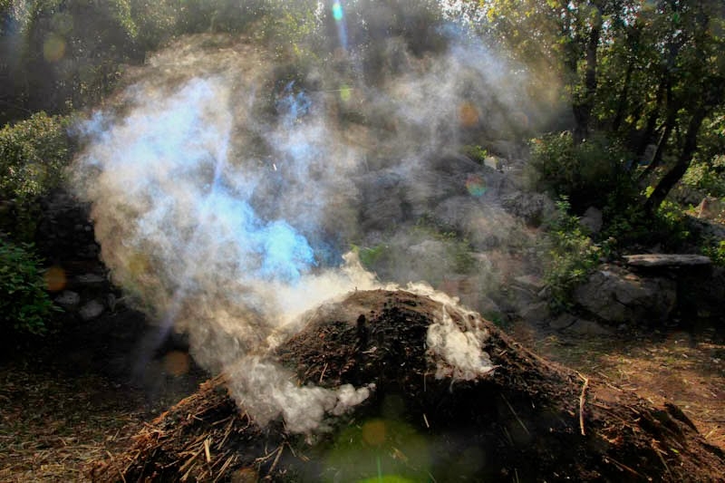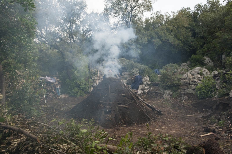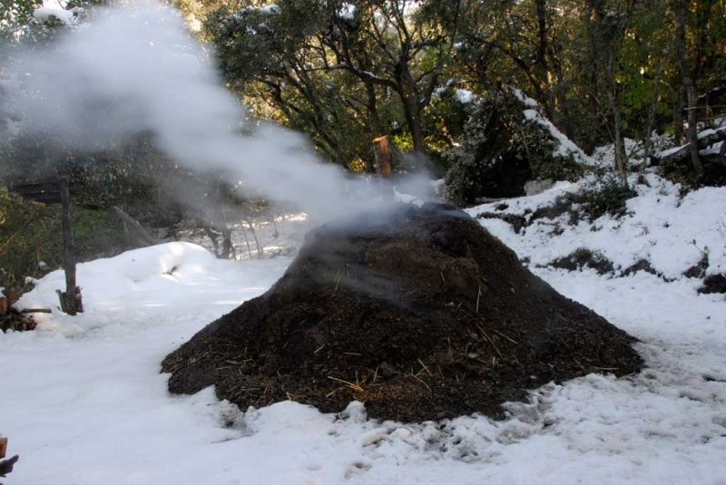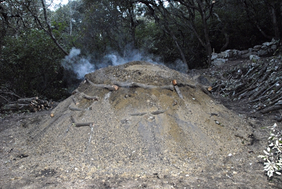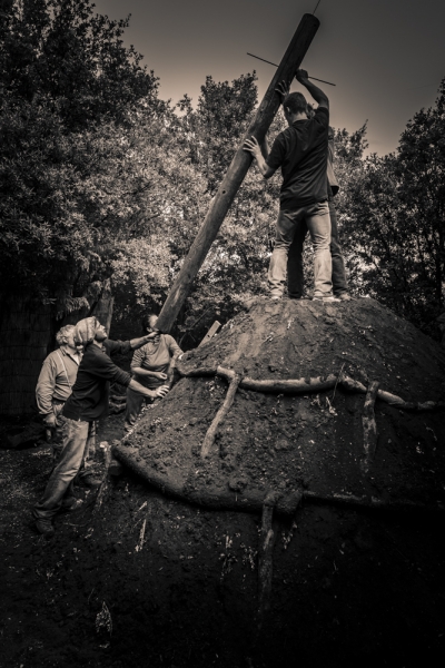 Je suis arrivé au final du montage de la meule. Belle et majestueuse, elle s’enroulait autour d’un grand « pal ». La taille était quasi celle de nos charbonnières des garrigues, env. 8 stères. Après le déjeuné nous avons « buissé » la meule. Les buis avait été écrasé pendant plusieurs jours sous de grosses pierres. Parfaitement plat, il recouvre en tuilage le bois. La terre, elle est noir charbon, riche des poussières carbonées des années précédentes. La meule fut rapidement recouverte et passa sa première nuit, fière et droite. Bien sur le poteau central avait été enlevé. Un arrachement énergique pour faire glisser le poteau vers le haut. Deux jeunes hommes forts, Fabien et Evan, ont accompli cet acte important en s’aidant d’une tige de fer passée au travers du pal. Ho Hisse!