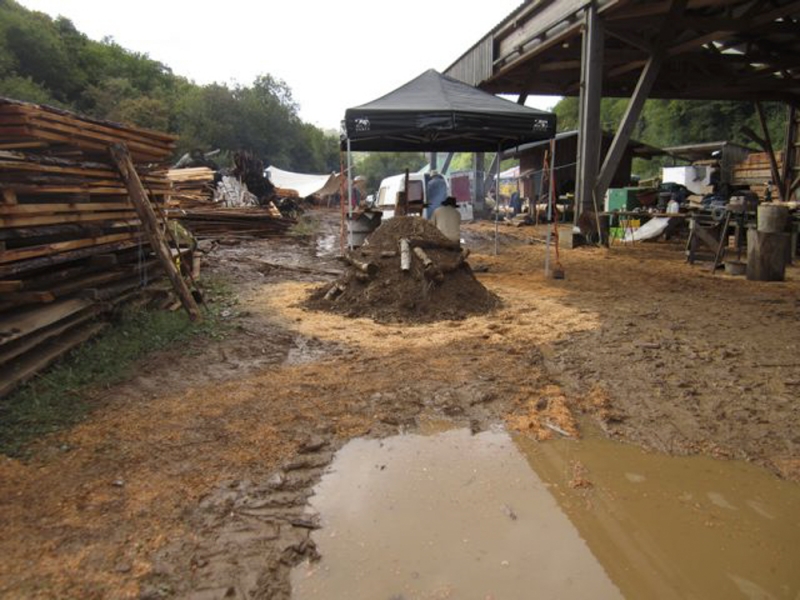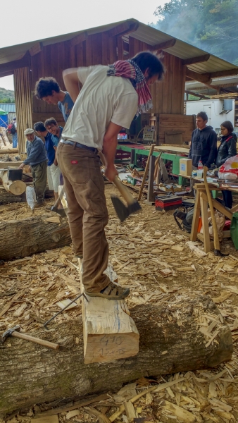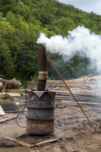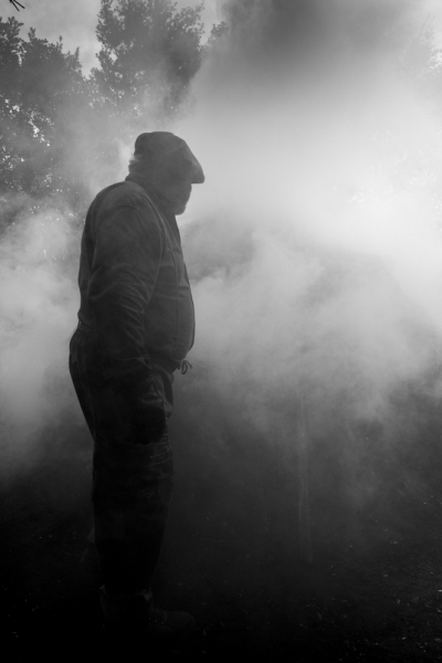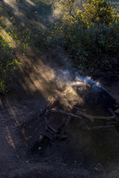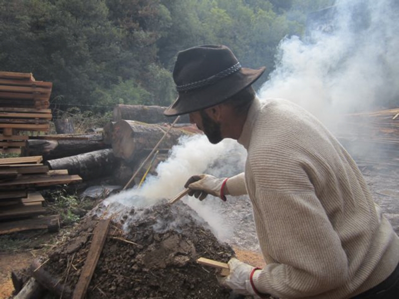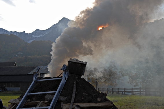 Au petit matin (hum hum vers 8h) Jean a allumé le feu dans la meule. Moment fort qui marque le début de l’art du charbonnier devenant le « maitre du feu ». Moment fort…piquant car la fumée s’épaississant de plus en plus, les yeux demandent grâce, ce qui est impossible à leur accorder.