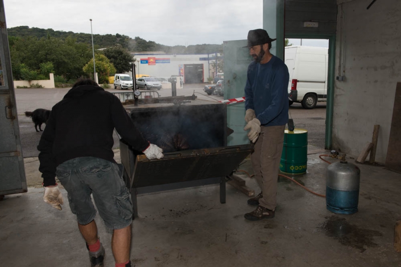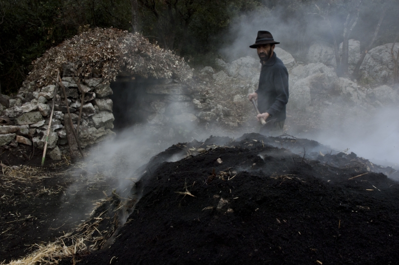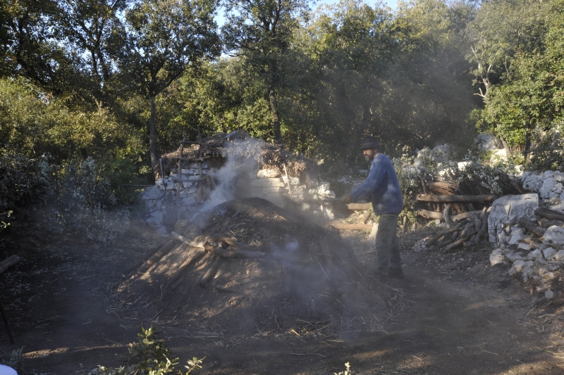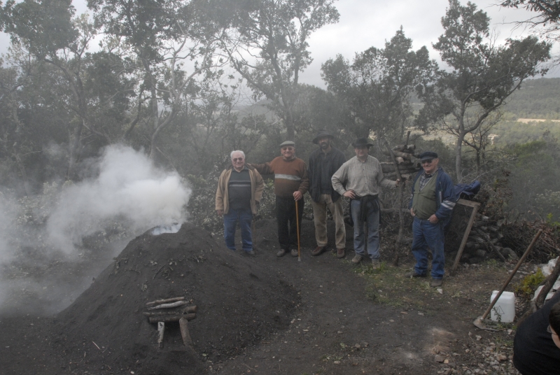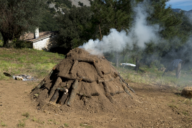 Pas très loin de la belle vallée de l’Ardèche, vers la ville de Bourg-Saint-Andéol, Jean a une « campagne » idéale. Mazet, capitelle, cabane de pêcheur en roseaux , vaste abri couvert, avec de part et d’autre de la garrigue et un verger mélangé. Mais surtout un superbe emplacement de charbonnière. Depuis 11 ans, Jean, avec une équipe fluctuante et surtout sa compagne Anne Marie, organise une rencontre du patrimoine dans sa propriété. Frère d’anciens charbonniers qui ont œuvré jusqu’en 1989, il a participé à cette activité avec comme point final une meule de 150 tonnes. Du costaud. Occitaniste convaincu et largement ouvert aux échanges, ses rendez vous sont l’occasion de rencontrer des érudits, des passionnés, des personnages parlant l’occitan, le provençal ou le patois.