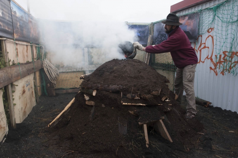 Laure, Evan et Fabien se sont relayés, pour alimenter le feu. Des « mouches », imbrulés des cuissons précédentes, ont été précipité dans la cheminée centrale. Au bout de 2h30 la combustion s’est révélée suffisante pour boucher le trou central et passer en carbonisation totale. La conduite du feu allait occuper le reste du temps. Violaine et Barbara se sont rajoutées pour la garde de nuit.