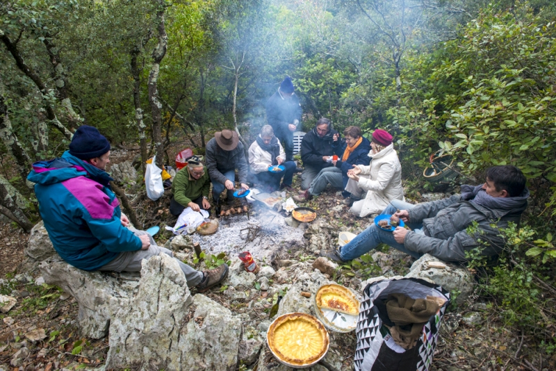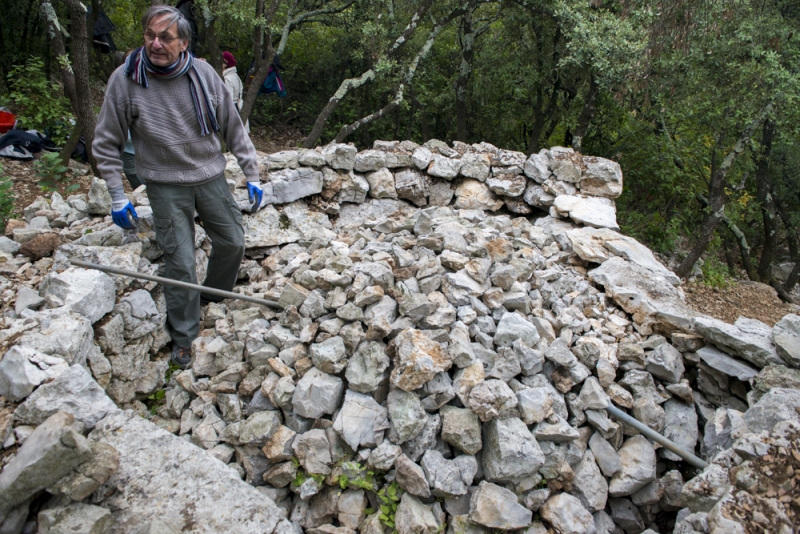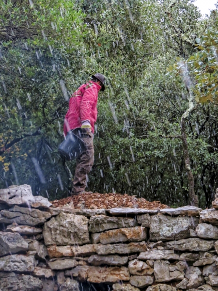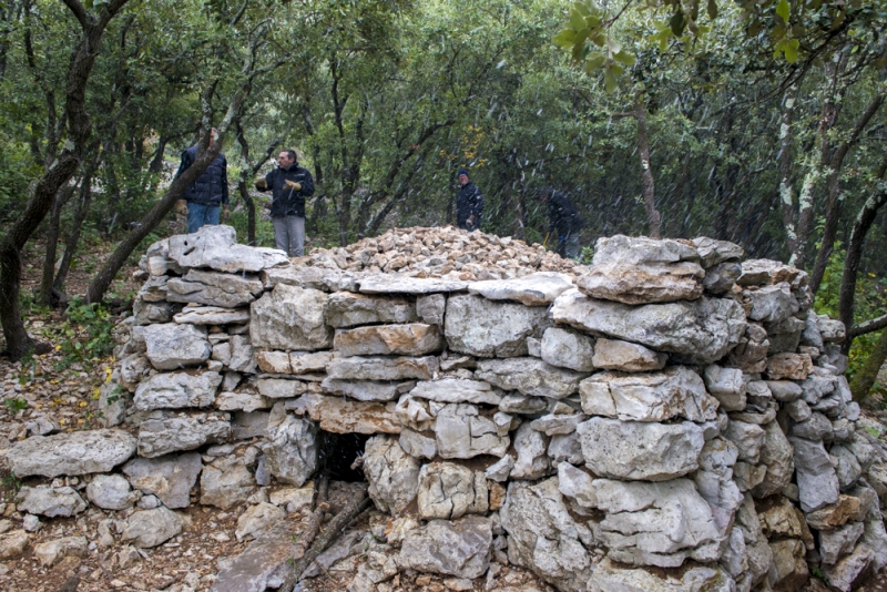La section patrimoine du foyer rural Les Quintillades a repris ses activités. Cette année nous continuons notre recherche et valorisation des fours à chaux des garrigues. Ces fours à chaux sont tout au long du parcours du Sentier des Charbonnières de l’écosite de Sainte-Croix-De-Qintillargues. Il y a deux fours anciens qui sont présentés, un four un peu à l’extérieur du chemin et un four que nous construisons. L’objet de cette construction est de pratiquer une cuisson expérimentale pour retrouver les gestes des anciens. Ce sont des fours ramiers, c’est à dire que l’on utilisait de la ramille (fagot de branches) pour avoir les 900° degrés nécessaires. La calcination du calcaire ne se produit qu’à partir de cette température qu’il faut garder jour et nuit, sans arrêt. Un dur labeur avec une approche difficile de la gueule du foyer, à cause de la t°, et la quantité astronomique de fagots qu’il faut pour aller jusqu’au bout. Ce type de four n’a plus été utilisé depuis la moitié du 19ème siècle car ils ont été remplacé par des four bâtis beaucoup plus productifs. Nos anciens avaient des gestes qui se sont perdus malgré les nombreuses publications qui parlent technique de la pierre mais pas des hommes, les chaufourniers.